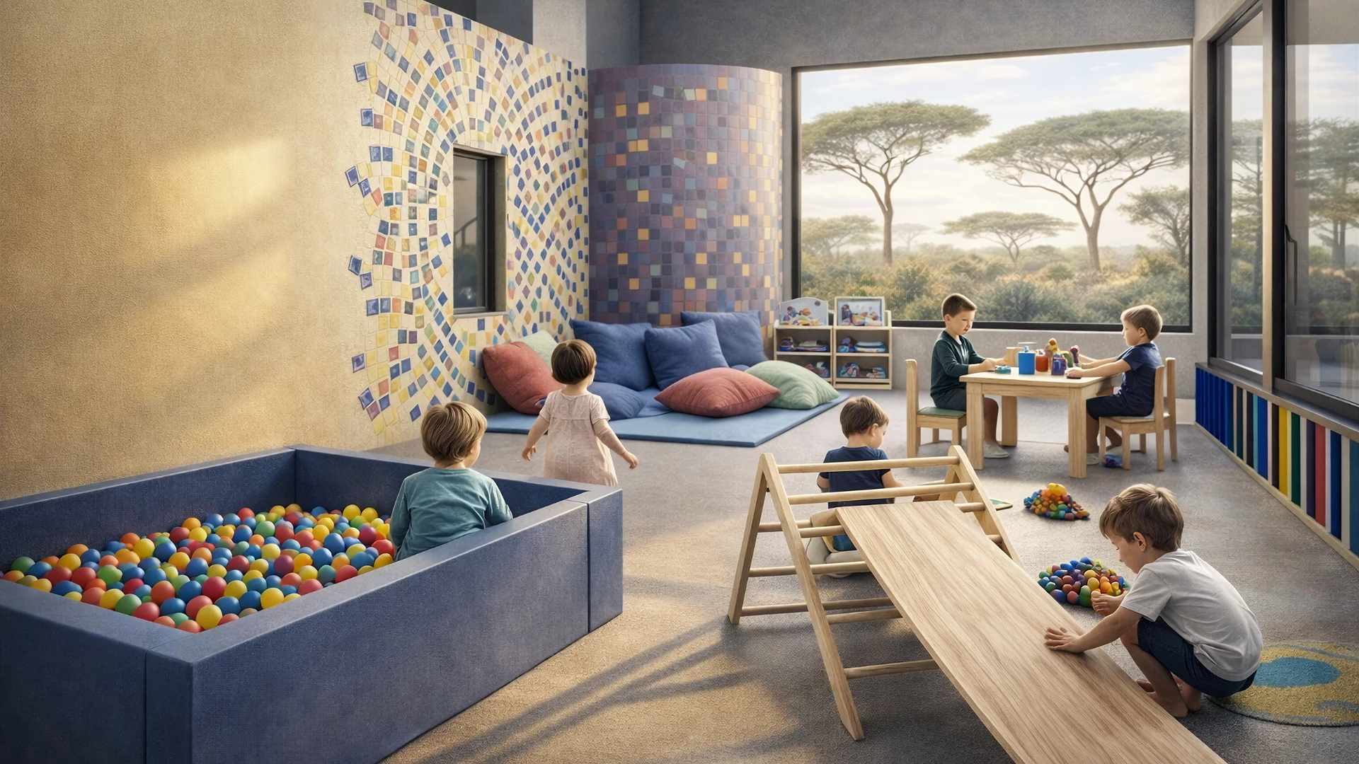 Pensé en collaboration avec des professionnels de la santé et de l’éducation, le projet accorde une attention particulière au développement sensoriel, moteur et social des enfants. Les matériaux sont robustes, durables et doux au toucher, les couleurs soigneusement choisies pour stimuler sans surcharger, et la lumière naturelle accompagne chaque espace de manière apaisée.