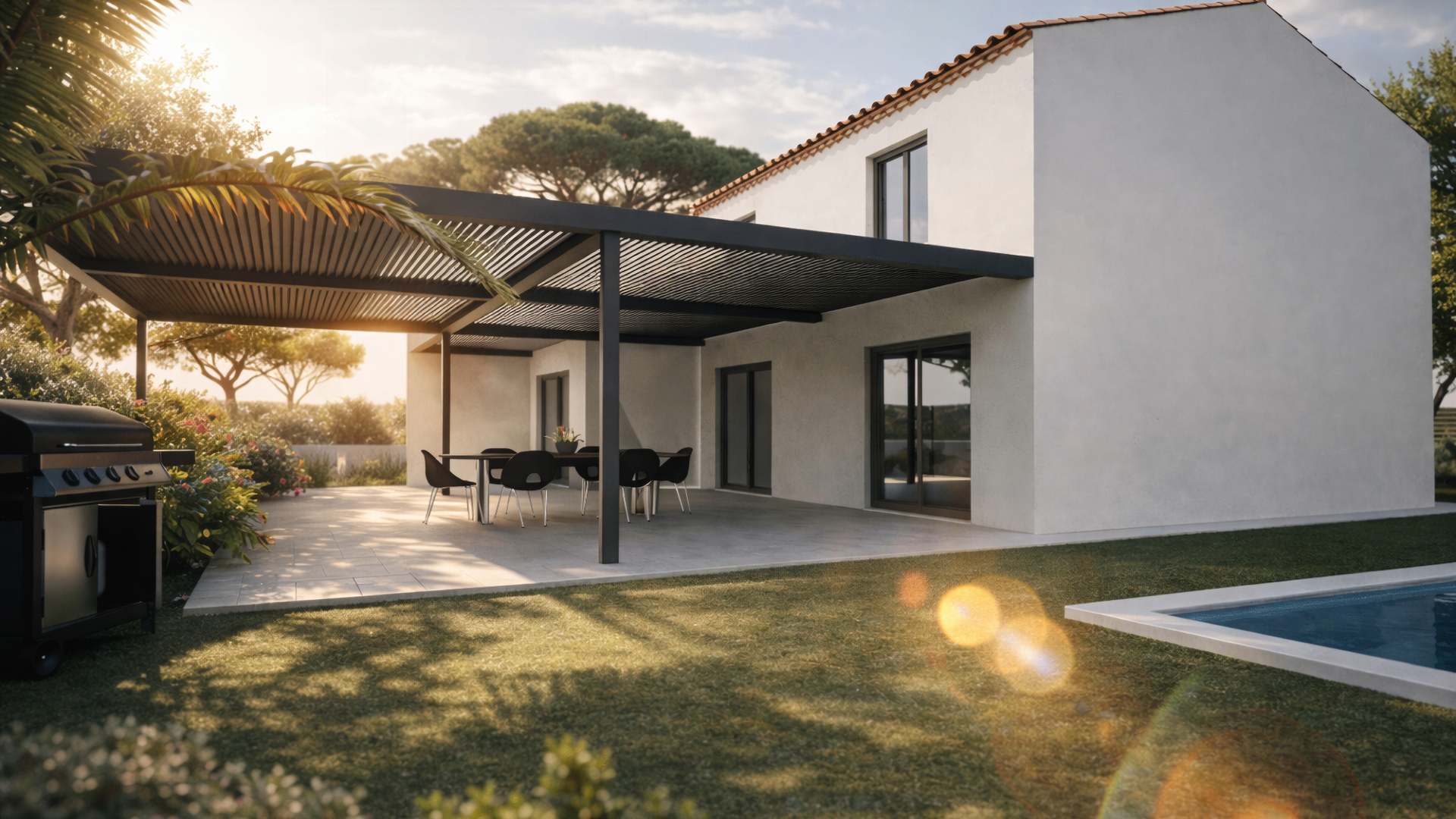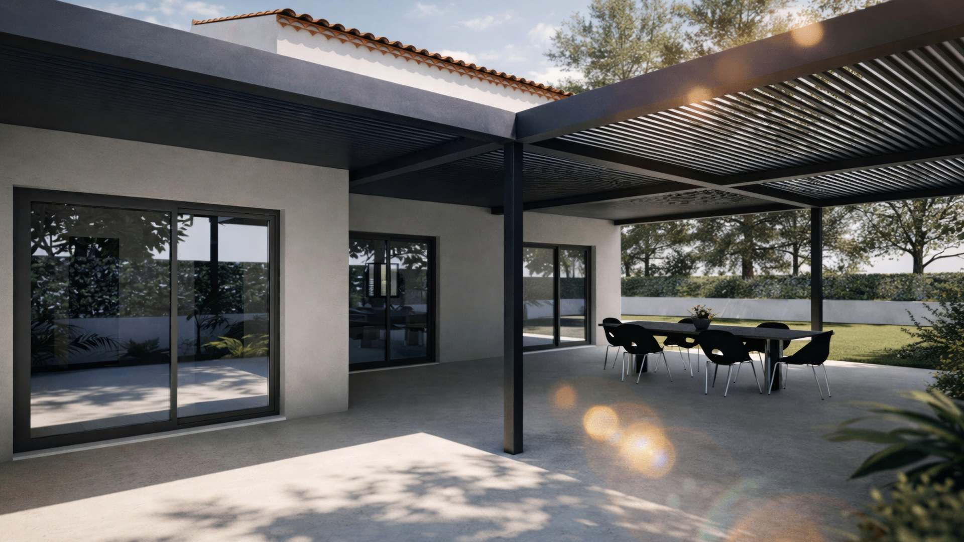 Cette extension s’inscrit avec justesse dans l’existant, prolongeant la villa par un nouvel espace de vie ouvert sur le jardin. La création d’une pergola bioclimatique structure la relation entre intérieur et extérieur, offrant une pièce en plus à ciel maîtrisé. Son dessin sobre et contemporain dialogue avec les volumes enduits et la toiture traditionnelle, affirmant une écriture discrète et élégante. Les lames orientables filtrent la lumière méditerranéenne, protègent des surchauffes estivales et favorisent une ventilation naturelle, garantissant un confort d’usage tout au long de l’année. Sous la pergola, la terrasse devient un lieu de partage, naturellement relié aux espaces de vie intérieurs par de larges baies vitrées. Les vues s’ouvrent sur le jardin et la piscine, renforçant la sensation de continuité et de fluidité des usages. Les matériaux choisis, durables et pérennes, participent à l’harmonie de l’ensemble et à la performance globale de la maison. L’intervention, mesurée et précise, valorise la villa existante tout en répondant aux modes de vie contemporains, entre ombre, lumière et art de vivre en extérieur.
